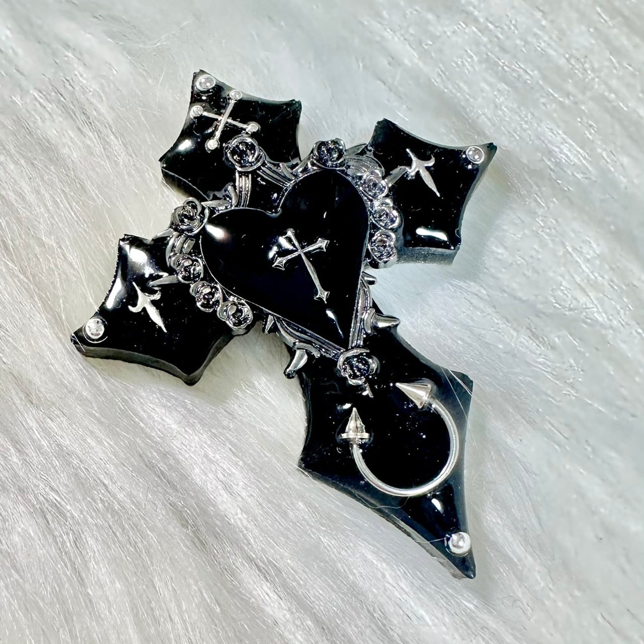 【1点物】ʚ神秘な十字架ピンɞ ハンドメイドアクセサリー ハンドメイド ヘアピン ヘアゴム レジン ゆめかわいい 病みかわいい 天使界隈 韓国 個性派 原宿系 ロリィタ 量産 地雷 サブカル y2k 黒 ピアス ブラック ハート