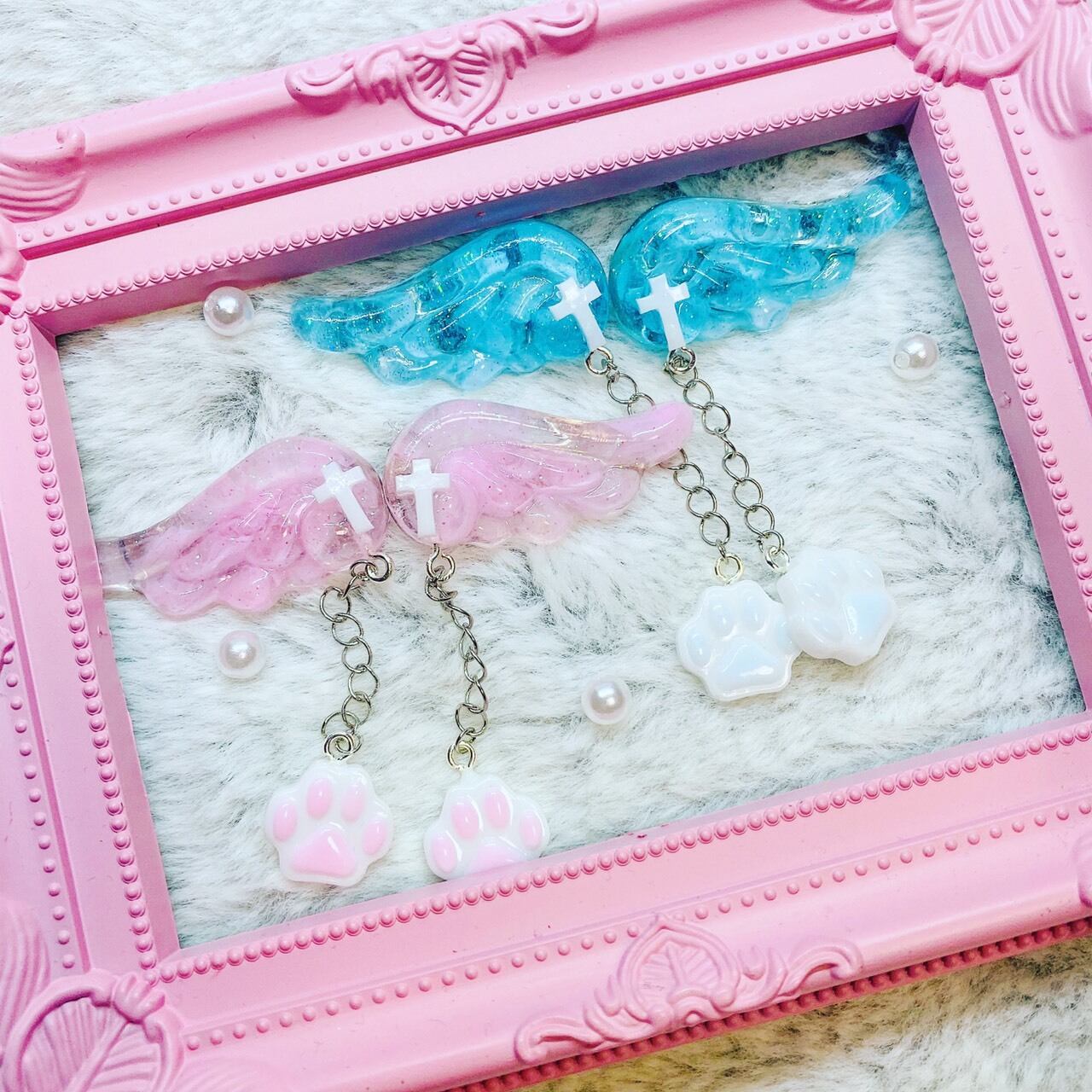 2色♡ʚふわにゃんピンɞ 猫 ヘアピン 十字架 羽 ゆめかわいい メンヘラ 水色 ピンク 肉球 ロリィタ 甘ロリ ハンドメイド レジン アクセサリー